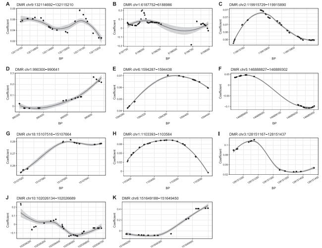 采用comb-p矯正p,鑒定出11個(gè)FDR<0.1的DMR,其中9個(gè)FDR<0.05,位于染色體1、2、3、5、6、9、10和18 。4個(gè)有意義的 DMRs (從chr 1:1103393-1103564,chr 1:990300-990641;chr 6:1594287-1594438;?chr 10:102026134-102026689 )包含了有顯著(zhù)意義的CpGs 。4個(gè)DMR位于基因間區,其余7個(gè)注釋在9號染色體LINC01503(RNA基因)、5號染色體DPYSL3(與非酒精性脂肪肝相關(guān)), 1號染色體CHD5和AGRN(有研究孕婦體重指數對新生兒血液DNA甲基化的影響), 2號染色體C1QL2, 10號染色體CWF19L1, 及6號染色體 AKAP12。圖中展示了11個(gè)DMR的甲基化模式,除了圖f和j的DMR與BMI呈負相關(guān)外,其余9個(gè)DMR與BMI呈正相關(guān)。采用Danish雙胞胎的基因表達數據,檢驗了與11個(gè)DMR相關(guān)的7個(gè)基因表達水平與BMI的相關(guān)性。LINC01503和AKAP12有顯著(zhù)意義。