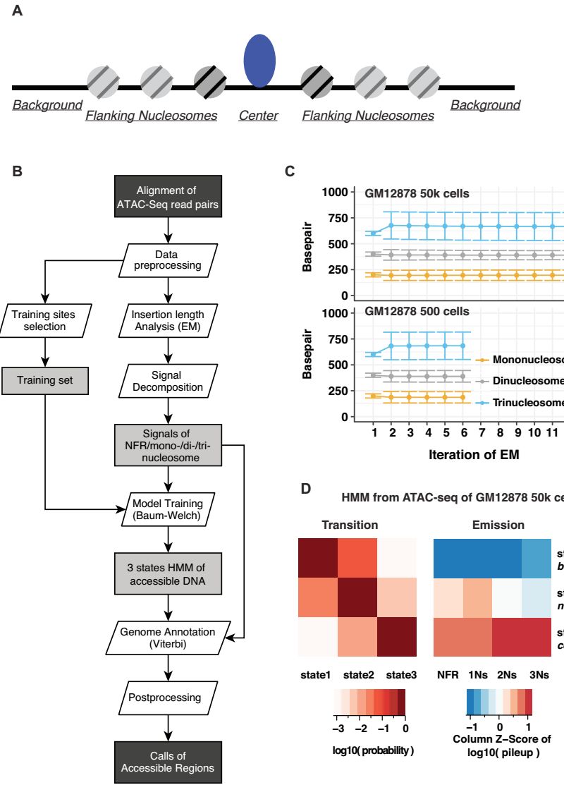 因此,作者提出了針對ATAC-seq數據的分析工具,HMMRATAC,一種基于半監督機器學(xué)習方法。?HMMRATAC軟件的主要思想是decomposition and integration(分解和集成),首先將單個(gè)ATAC-seq數據集分成無(wú)核小體(nucleosome-free regions, NFR)和核小體富集信號,用隱馬爾科夫模型(HMM)訓練開(kāi)放區域周?chē)毺氐娜旧|(zhì)結構,然后預測整個(gè)基因組中的開(kāi)放區域。?該方法利用了ATAC-seq數據的獨特特征來(lái)識別的染色質(zhì)的結構更準確。