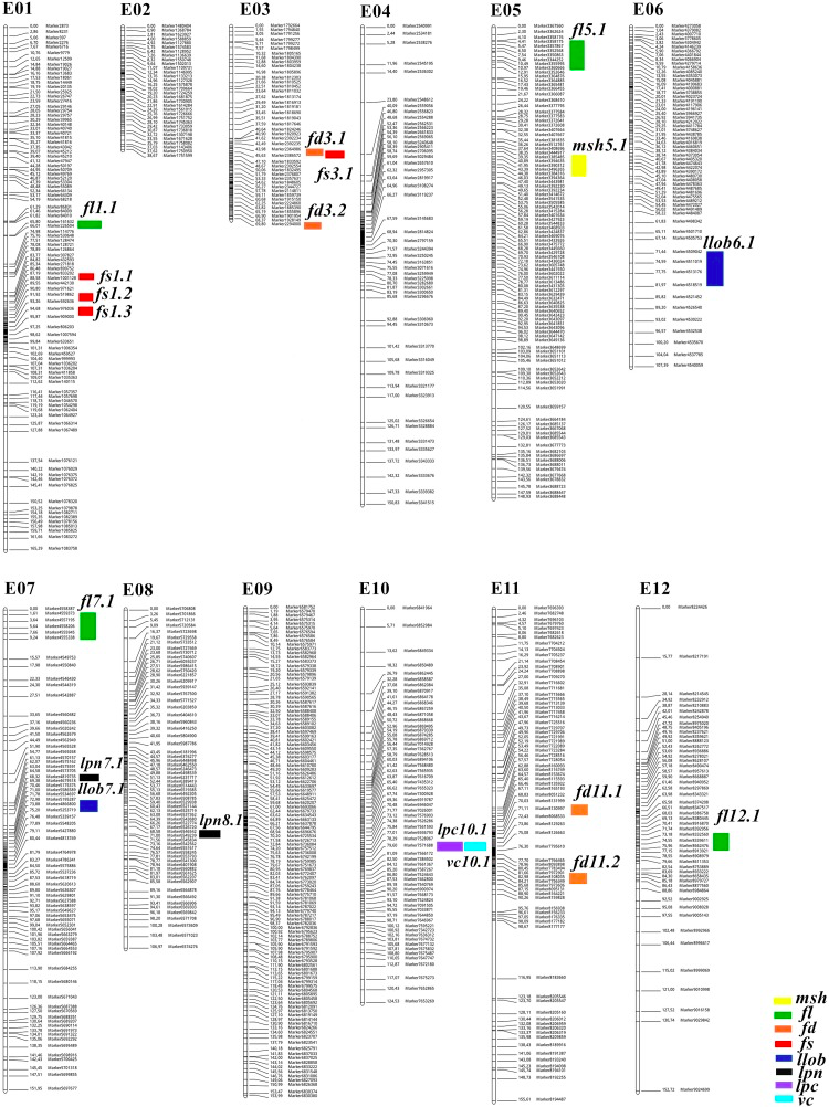 FL定位到4個(gè)QTL,即fl1.1, fl5.1, fl7.1, 與fl12.1,分別位于LG1,5,7,12上。最主效的QTL為fl12.1,可解釋24.05% 的表型變異,其次為fl1.1與fl5.1(PVE為12.00與13.06%),貢獻率最低的為fl7.1(PVE僅為4.08%),此外,在fl5.1中鑒定到11個(gè)SNPs。這4個(gè)QTLs中,除fl12.1的標記Marker8964317遠離其它兩個(gè)相鄰的標記外,其它QTL標記均處于合理的距離。