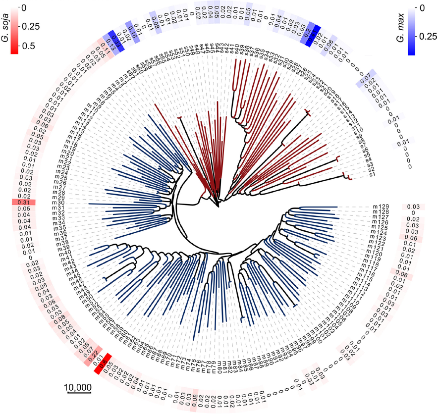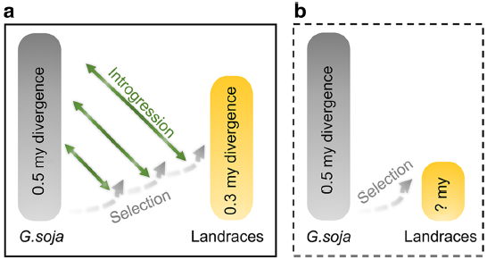 根據基因序列分析,PI 578357和黑河小黃豆之間及PI 339734和PI 407275之間的分歧時(shí)間分別可追溯到約0.37和27萬(wàn)年前(mya)。由于大豆的馴化發(fā)生在大約6000-9000年前,兩對(野生大豆-栽培大豆)品種之間所檢查的滲入區域的如此高的相似性應被視為野生大豆-栽培大豆滲入的直接證據。