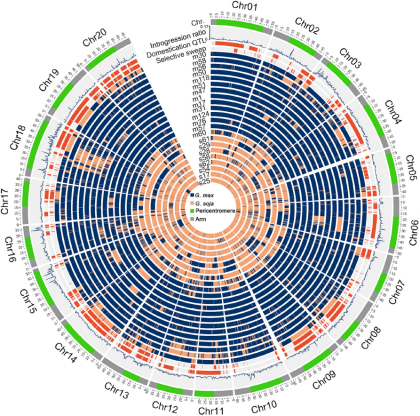 環(huán)形從外至內依次表示(i)染色體臂(灰色),近著(zhù)絲粒區(綠色) (ii)群體水平的基因滲入比例在各條染色體的分布(iii)馴化相關(guān)QTL位點(diǎn)在各條染色體的分布(紅色) (iv)選擇掃蕩區域在各條染色體的分布(紅色) (v)具有代表性的12份栽培大豆及10份野生大豆材料基因滲入區間的在各條染色體的分布:栽培大豆片段(藍色),野生大豆片段(橙色)
