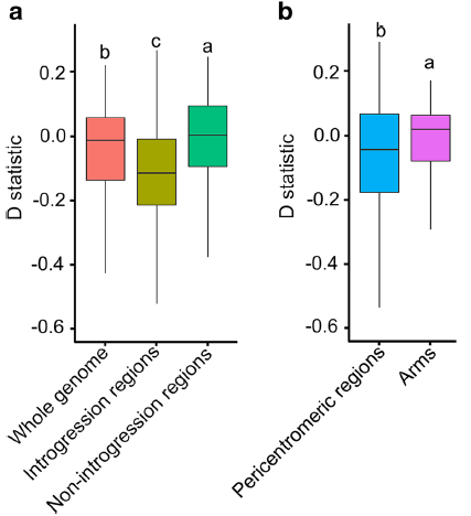 具有推定基因滲入區域的D統計量顯著(zhù)低于沒(méi)有推定基因滲入區域,并且也顯著(zhù)低于全基因組平均水平,這表明野生大豆和栽培大豆間的基因流與這些基因區域有關(guān)(圖3)。