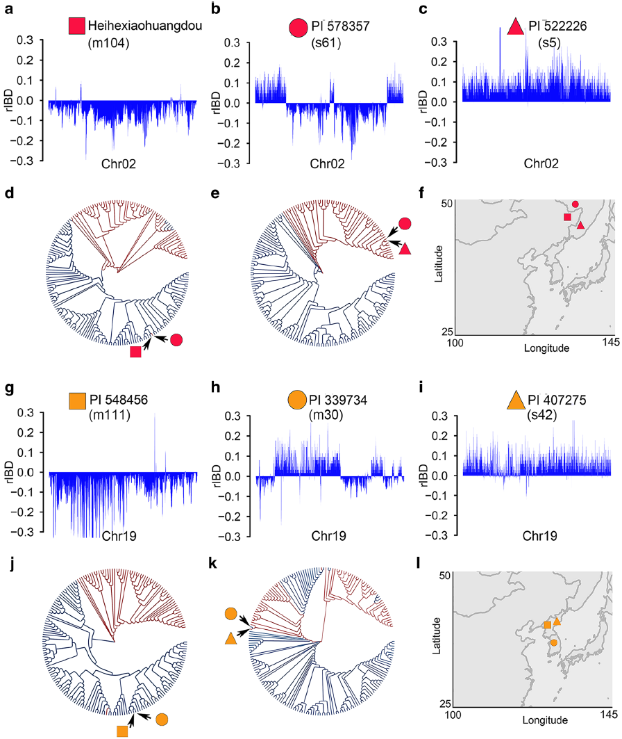 (a-c)黑河小黃豆, PI 578357和PI 52226三個(gè)材料中基因組成分在2號染色體的分布(d)基于2號染色體基因滲入區域SNP構建的進(jìn)化樹(shù)揭示的PI 578357中PI 52226成分的起源(e)基于2號染色體非基因滲入區域SNP構建的進(jìn)化樹(shù)揭示的PI 578357中黑河小黃豆成分的起源(f)上述三個(gè)材料的地理分布(g-i) PI 548456, PI 339734和PI 407275三個(gè)材料中基因組成分在19號染色體的分布(j)基于19號染色體基因滲入區域SNP構建的進(jìn)化樹(shù)揭示的PI 339734中PI 548546成分的起源(k)基于19號染色體非基因滲入區域SNP構建的進(jìn)化樹(shù)揭示的PI 339734中PI 407275成分的起源(l)上述三個(gè)材料的地理分布