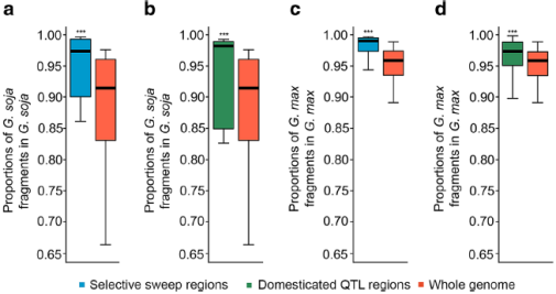 相較于在野生大豆種質(zhì)中檢測到的基因組其他區域,與選擇性?huà)呙鑵^域相應區域中的栽培大豆片段比例顯著(zhù)降低(圖5a)。相比之下,與栽培大豆基因組相比,選擇性?huà)叱齾^中野生大豆片段在基因組其他區域的檢出率顯著(zhù)降低(圖5c)。在栽培大豆或野生大豆相應馴化QTL區域中,滲入片段比例比選擇性?huà)呙鑵^域中檢測到的?。▓D5b,d)。這些結果表明雙向選擇,即自然選擇與人工選擇,對野生大豆和栽培大豆中滲入片段的保留具有不同的結果、影響。