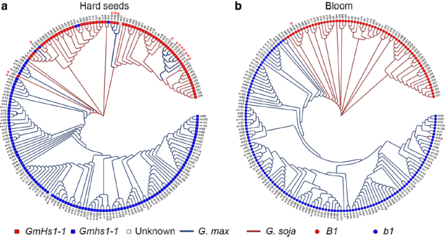 基因滲入被認為是基因流的主要途徑,那么基因流如何在種群水平上影響馴化過(guò)程和大豆基因組的遺傳結構?現有研究已分離出分別控制種子硬度和種皮開(kāi)花的關(guān)鍵大豆馴化基因GmHs1-1和Bloom1(B1),圍繞GmHS1-1、Gmhs1-1和B1、b1基因座的兩個(gè)選擇性?huà)叱齾^域中的SNP分析系統發(fā)育關(guān)系發(fā)現基因滲入現象在這兩個(gè)區域均有存在??紤]到野生大豆和栽培大豆亞種的系統發(fā)育差異,在研究種群中兩個(gè)馴化基因位點(diǎn)檢測到的選擇性?huà)呙鑵^域和單倍型的混合將被視為亞種群間基因流動(dòng)的進(jìn)一步證據。