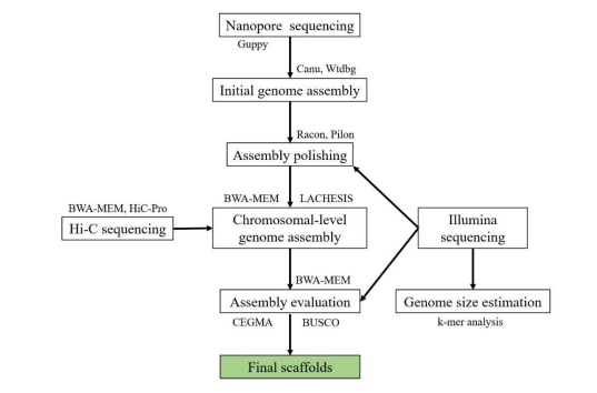 占比地球容量71%的海洋中蘊藏著(zhù)豐富的生物資源,而海洋生物體內多糖和蛋白含量較高,以及部分海洋生物極易死亡腐敗從而引起DNA的降解,給高純度、完整的基因組DNA的獲取帶來(lái)了極大的困難。而海洋生物通常與陸生動(dòng)植物相比更為復雜,組裝拼接的難度更大。本次研究使用Nanopore測序技術(shù)突破了這些瓶頸,完成了海洋魚(yú)類(lèi)超高質(zhì)量的基因組組裝!研究中使用104X Nanopore測序數據進(jìn)行基因組組裝,通過(guò)Canu、WTDBG等多款軟件分別進(jìn)行組裝,選取組裝結果(主要從基因組大小,contig N50,組裝完整性,組裝準確性等方面評估)進(jìn)行后續研究?jì)?yōu)化。研究者最終使用WTDBG軟件組的基因組版本結合Hi-C技術(shù)的進(jìn)一步優(yōu)化,組裝完成474.31 Mb基因組,并將99.44%的基因組掛載至20條染色體上,?ContigN50提升至22.46 Mb,且最長(cháng)的Contig達到32.32 Mb!