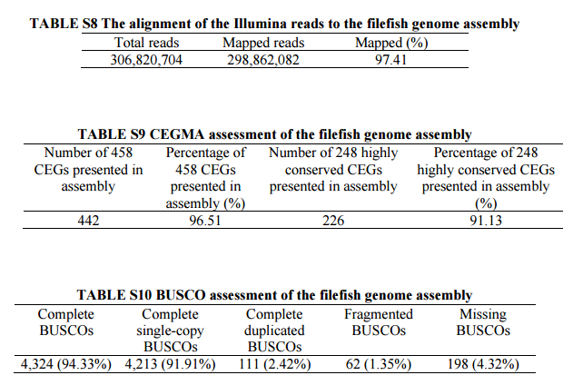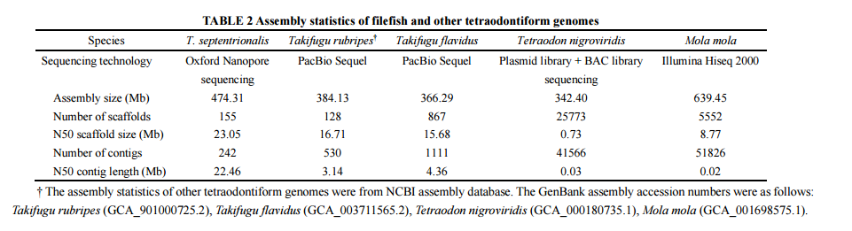 眾所周知,Contig N50是衡量基因組組裝質(zhì)量好壞的一個(gè)重要指標,一定程度上來(lái)說(shuō),ContigN50值越高表示組裝的質(zhì)量越好。與已有鲀形目基因組比較,綠鰭馬面鲀基因組組裝的ContigN50超過(guò)了同樣使用三代測序進(jìn)行組裝的黃鰭東方鲀(Takifugu flavidus)的5倍,更是超過(guò)了翻車(chē)魚(yú)(Mola mola)的1000倍!