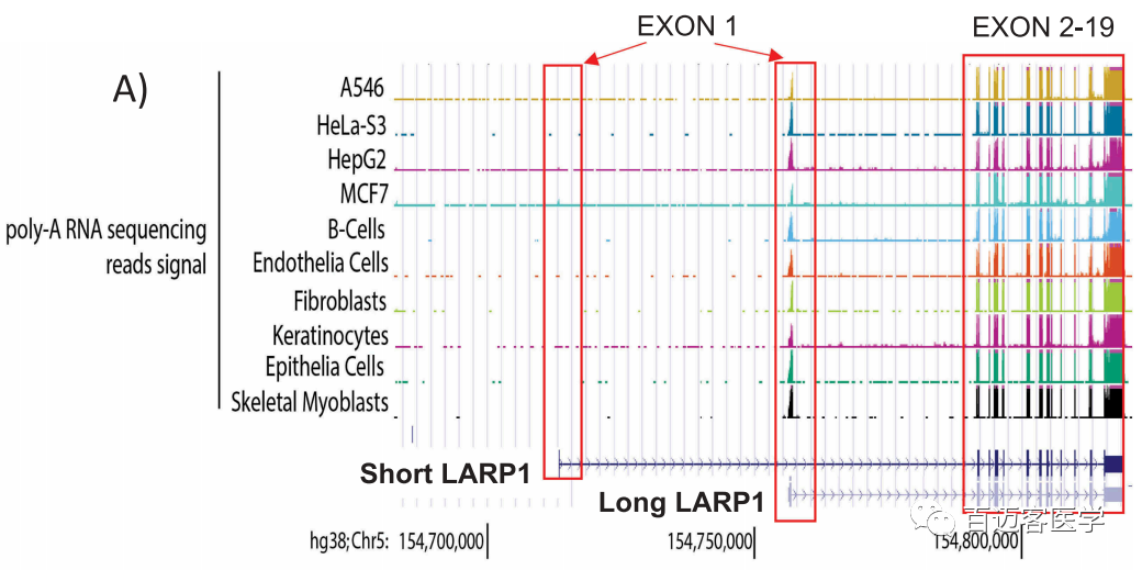 二代短reads polyA轉錄組公共數據分析:為了研究LARP1在細胞中的表達譜,作者使用了可公開(kāi)獲得的RNA測序數據集。共計從198個(gè)組織、128個(gè)細胞系和54個(gè)原代細胞系中提取了371個(gè)包含poly-(A)的RNA測序數據集,并將其reads與包含所有預測的LARP1 isoform的hg38:Chr5 154700000至154850000染色體區域比對(圖2A)。首先關(guān)注測序reads與第一個(gè)外顯子的比對,兩個(gè)LARP1亞型不同的區域。發(fā)現測序數據特異比對到長(cháng)LARP1同工型的外顯子1,沒(méi)有reads比對到SI-LARP1的外顯子1。2個(gè)isoform間共享的第2-19號外顯子已完全被測序數據所覆蓋。
