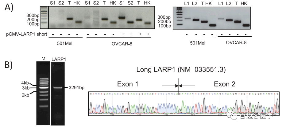 特異性引物擴增及sanger測序驗證實(shí)驗:為了驗證ONT全長(cháng)轉錄組測序發(fā)現的LI-LARP1是主要isoform,作者設計了2對特異性引物,以通過(guò)PCR檢測短或長(cháng)LARP1 isoform或2種總和(使用保守的exon 7上的引物,此處稱(chēng)為“總LARP1”)(圖3)。設計對應于每個(gè)LARP1 isoform外顯子1的正向引物和下游外顯子的外顯子連接處的反向引物。這些引物有效性通過(guò)重組SI-LARP1或LI-LARP1表達后的成功擴增得到證實(shí)。設計用于檢測總LARP1的引物,以在所有預測的isoform共有的第7外顯子上退火。結果發(fā)現LI-LARP1在501-MEL(黑色素瘤細胞系)和OVCAR-8細胞中表達,但未檢測到SI-LARP1的PCR擴增產(chǎn)物(圖3A)。對所有PCR產(chǎn)物進(jìn)行測序以驗證所需的擴增子。接下來(lái),設計了對長(cháng)LARP1 isoform(LI-LARP1)的開(kāi)放閱讀框具有特異性的引物,并通過(guò)cDNA文庫中的PCR進(jìn)行了擴增,PCR產(chǎn)物的sanger測序結果揭示了LI-LARP1預測的完整核苷酸序列,包括其特定的外顯子1(圖3B)。值得注意的是,所有試圖擴增SI LARP1 isoform編碼序列的嘗試均告以失敗,表明該isoform在得到的cDNA文庫中不存在。