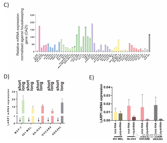 為了確定LI-LARP1是否在更廣泛的癌細胞系中表達,作者用qRT-PCR檢測了NCI-60癌細胞系(美國國立癌癥研究(NCI)規定的60種用于藥物篩選的癌細胞系,包括黑素瘤、腎癌、卵巢癌、腦癌、白血球增多癥、乳腺癌、非小細胞肺癌和前列腺癌細胞系)(圖3C)。盡管樣品之間LI-LARP1的表達差異高達37倍,但在所有細胞系中均可檢測到。然而,所有系中SI-LARP1表達均低于檢測閾值(cT值<35)。并測量NCI的5種癌細胞系(MCF-7、OVCAR-8、SK-OV-3、501-MEL和HEK-293T)中的SI和LI-LARP1表達驗證了這些發(fā)現(圖3D)。在所有五個(gè)細胞系中,LI LARP1的水平至少比SI-LARP1高1000倍。由于SI-LARP1的表達水平接近或低于檢測極限,因此作者探討了其余檢測到的轉錄本是否為人工產(chǎn)物。成熟的mRNA的標志是存在3?poly-(A)尾,這是其核輸出所必需的。從OVCAR-8、SK-OV-3、501-MEL和HEK-293T中提取的總RNA使用隨機或寡聚(dT)引物進(jìn)行反轉錄(圖3E)。隨著(zhù)隨機引物與RNA庫中任何類(lèi)型的轉錄本退火,PCR擴增還將檢測未加工完成的mRNA種類(lèi)。相反,寡聚(dT)引物導致多聚腺苷酸化(帶polyA)的mRNA發(fā)生特定的逆轉錄。使用基因特異性引物測量2個(gè)cDNA文庫中SI-和LI-LARP1 isoform的水平。將表達水平使用管家基因OAZ1標準化,計算相對表達量。作者發(fā)現完全加工和多聚腺苷酸化的SI-LARP1 mRNA的水平低于檢測極限,表明SI-LARP1 mRNA表達但未完全加工成成熟的聚腺苷酸化的mRNA。