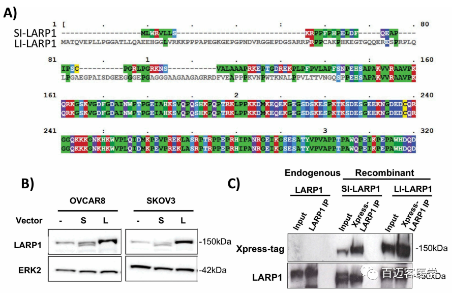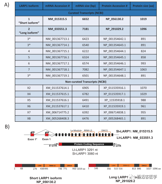 圖1A為NCBI基因數據庫中列出的9種不同的LARP1經(jīng)驗證的isoform。LARP1典型轉錄本為NM_015315.5,編碼1019個(gè)氨基酸(NP_056130.2)的蛋白質(zhì),在此處稱(chēng)為“ SI-LARP1”。UniProtKB數據庫引用了另一個(gè)比較長(cháng)的轉錄本NM_033551.3作為L(cháng)ARP1的規范形式,它對應于1096個(gè)氨基酸蛋白(NP_291029.2),在此稱(chēng)為“LI-LARP1” 。SI-LARP1蛋白與LI-LARP1不同,它缺少前77個(gè)氨基酸,并且氨基酸M1至N67不同。
