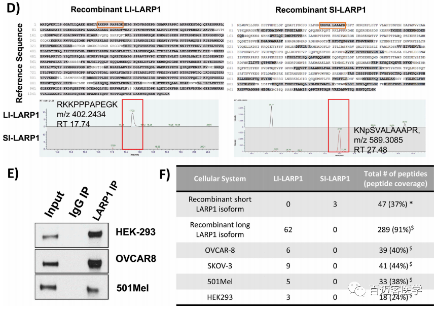 為了驗證這一點(diǎn),首先,在OVCAR-8細胞中異位表達了2種LARP1 isoform,并使用針對共表達的Xpress標簽的抗體從粗蛋白裂解物中免疫沉淀富集LARP1蛋白(圖4C)–pull down實(shí)驗。隨后,使用胰蛋白酶或胰凝乳蛋白酶對樣品進(jìn)行溶液消化后,Shotgun LC MS/MS質(zhì)譜分析以鑒定對應于SI-或LI-LARP1 isoform的N端特異性肽段。鑒定了從序列位置45和46產(chǎn)生的3種肽(質(zhì)量為N46SVALAAAPR:485.2773 Th(m/z); K45NpSVALAAAPR:549.3257 Th(m/z); K45NSAVALAAAPR:589,3085 Th(m/z ))作為SI-LARP1的唯一特征(圖4D)。相反,對于LI-LARP1,鑒定了由與外顯子1對應的蛋白質(zhì)序列產(chǎn)生的152個(gè)肽。第二步,免疫沉淀富集OVCAR-8、501-MEL、SK-OV-3和HEK-293T細胞的內源LARP1,并進(jìn)行質(zhì)譜分析,使用監督自動(dòng)算法檢測預先指定的isofrom特異性肽(圖4E-F)。LARP1的肽覆蓋率范圍為內源性免疫沉淀蛋白的24-44%。盡管在所有4個(gè)細胞系中都鑒定出了與LI-LARP1 N端相對應的獨特肽,但我們無(wú)法在任何樣品中鑒定出對SI-LARP1亞型具有特異性的任何肽。這些結果與觀(guān)察到的不存在對應于SI-LARP1的mRNA相一致。