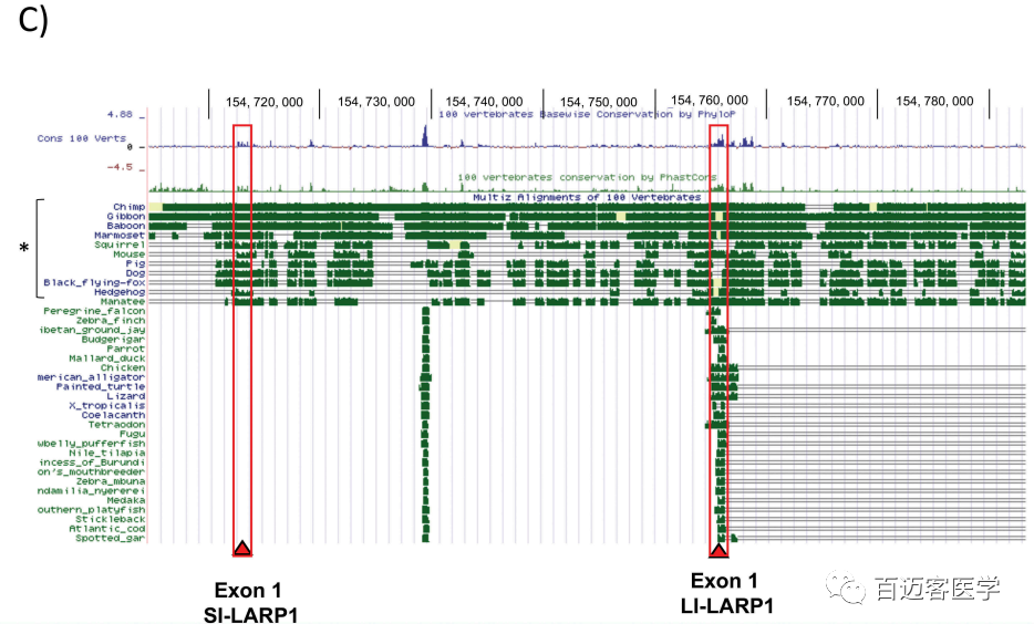 接下來(lái),作者對SI-LARP1是否可以發(fā)揮獨特的功能作用感興趣。為此分析了2種LARP1亞型的TSS區保守水平(圖5C)。作者假設,進(jìn)化保守將暗示選擇性壓力,因此每種亞型的作用不同。為了解釋LARP1亞型的進(jìn)化保守性,使用UCSC基因組瀏覽器在脊椎動(dòng)物(鳥(niǎo)類(lèi)、魚(yú)類(lèi)、兩棲動(dòng)物、爬行動(dòng)物、哺乳動(dòng)物)亞門(mén)上生成了100個(gè)可用LARP1序列的多序列比對。出乎意料的是,LI-LARP1外顯子1在整個(gè)亞科中都具有很強的保守性,但SI-LARP1外顯子1的保守性?xún)H存在于胎盤(pán)動(dòng)物分支中,其中包括人類(lèi)和其他靈長(cháng)類(lèi)動(dòng)物。這表明它可能在胎盤(pán)哺乳動(dòng)物的進(jìn)化晚期獲得了功能性作用。相比之下,LI-LARP1的保守性跨多個(gè)進(jìn)化分支表明作用更為古老。