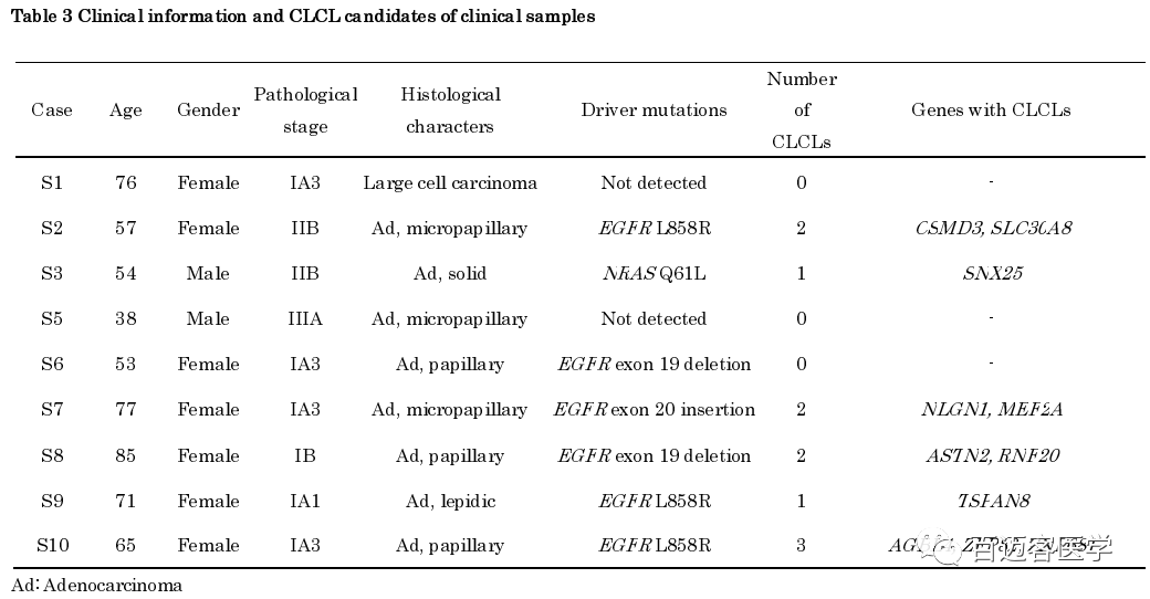 為了檢查臨床肺癌肺腺癌病例中是否也存在CLCL,對9名日本肺腺癌患者的手術(shù)標本進(jìn)行了類(lèi)似的PromethION全基因組測序(表3)。表3中顯示了每個(gè)患者所檢測到的驅動(dòng)基因突變。平均每個(gè)case生成了43,953,136,203 bp的序列(深度大于10倍)。對于S10病例,還對正常組織標本進(jìn)行了測序,以消除可能的正常組織變異和源自比對錯誤的可疑CLCL。
