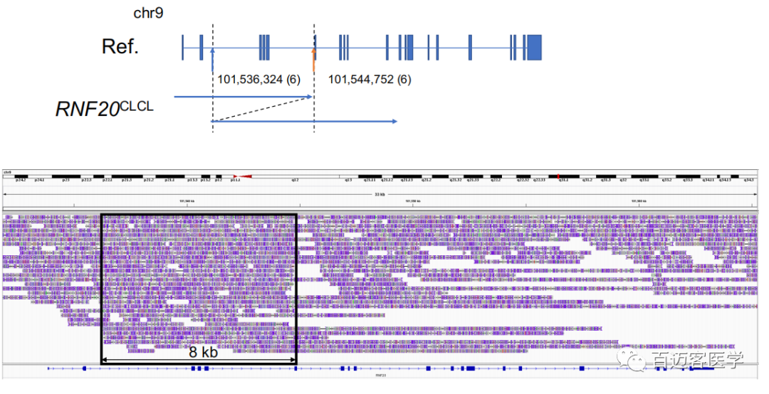 再次成功檢測到CLCL,9個(gè)樣本中有6個(gè)在其腫瘤基因組中至少包含一個(gè)CLCL,包括幾個(gè)關(guān)鍵的癌癥基因。例如,在病例S8中,確定了RNF20 CLCL。該患者為女性患者,已被證明具有EGFR外顯子19缺失作為驅動(dòng)突變。但是,其他癌癥突變仍然難以捉摸。RNF20基因的CLCL為內含子2(chr9:101,536,324)和內含子6(chr9:101,544,752)之間的串聯(lián)重復,這很可能導致該基因的功能喪失。RNF20基因編碼具有抑癌功能的E3泛素連接酶,并且經(jīng)常發(fā)生突變,特別是在肺癌中。表3總結了獲得患者致癌作用的分子病因學(xué)指征。需要進(jìn)一步擴展長(cháng)讀長(cháng)測序序列,以更√確地識別CLCL的頻率和CLCL偏好的基因。