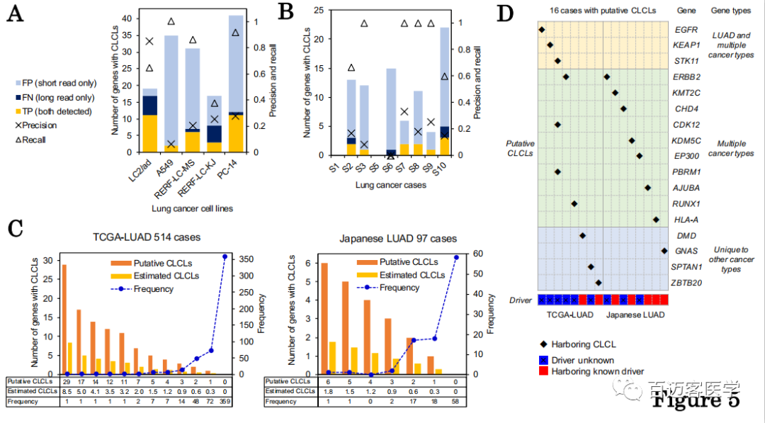 之后收集并分析了9個(gè)臨床病例約63X測序深度的全基因組短讀長(cháng)測序數據,分析可能的CLCL,確定了可能受推定的CLCLs影響的9個(gè)基因。如圖5B所示,從短讀長(cháng)數據開(kāi)始檢測到CLCL,估計靈敏度為73%。但是,由于較短的讀長(cháng)reads所固有的各種原因,z確率被限制為14%。