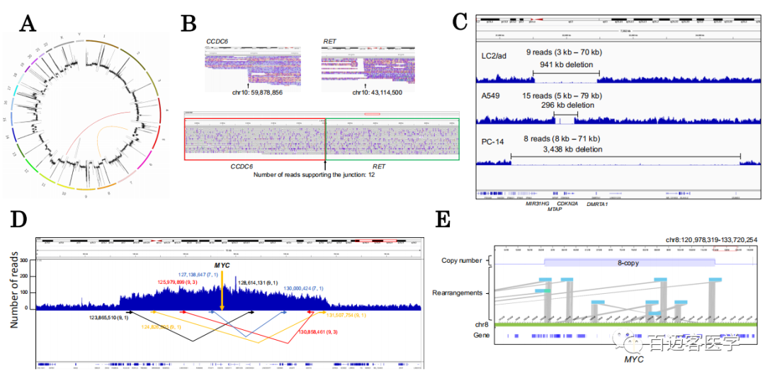 使用長(cháng)讀長(cháng)測序數據,嘗試檢測比點(diǎn)突變大的結構畸變(圖2A)。從LC2/ad的MinION/PromethION數據集中,成功鑒定出12條reads與CCDC6-RET融合基因的junction位點(diǎn)直接重疊,這是該細胞系已知的“癌癥驅動(dòng)突變”(圖2B)。進(jìn)一步嘗試鑒定大的缺失,前人報道抑癌基因CDKN2A基因周?chē)写蟮娜笔?,發(fā)生在LC2/ad,A549和PC-14細胞中。使用這項研究中的MinION/PromethION數據集,我們再次確認了該基因在各細胞中的缺失(圖2C)。此外,每個(gè)CDKN2A缺失的√確連接點(diǎn)在細胞類(lèi)型之間是不同的。