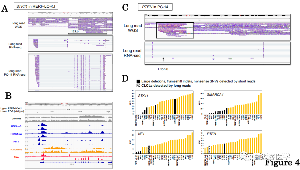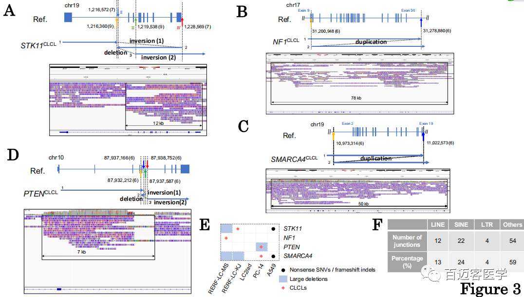 我們對其他CLCL進(jìn)行了類(lèi)似的分析,對于PC-14中的PTEN基因(圖4C),CLCL位于外顯子6。結果,該外顯子完全跳躍。因此,所得的轉錄本應移碼,可能導致PTEN基因的功能喪失。根據Illumina RNA-seq數據檢查了包含CLCL的STK11,NF1,SMARCA4和PTEN基因中的RNA表達水平。結果表明,CLCL通??赡軐е禄虮磉_水平降低(圖4D)。但是,在某些情況下,基因表達水平仍然很顯著(zhù),例如RERF-LC-MS細胞中的NF1轉錄本和PC-14細胞中的PTEN轉錄本。