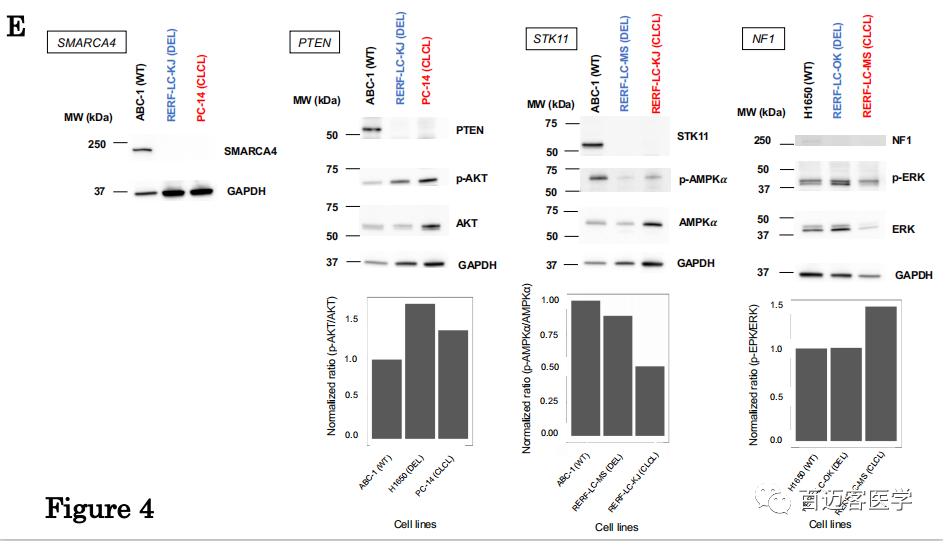 為了解決CLCL的生物學(xué)意義,作者研究了受CLCL影響的基因座如何引起蛋白質(zhì)表達水平及其相關(guān)信號通路變化。蛋白質(zhì)印跡WB分析發(fā)現STK11,NF1,SMARCA4和PTEN的蛋白質(zhì)在這些基因中帶有CLCL的細胞中完全丟失了(圖4E)。進(jìn)一步檢查了下游蛋白的激活狀態(tài),在所有檢查的case中均觀(guān)察到了預期的信號通路破壞。磷酸化的AKT(phospho-AKT)相應地激活mTOR信號通路,而PTEN抑制AKT的磷酸化。觀(guān)察到phospho-AKT異常上調,反映了PC-14細胞(PTEN-CLCL)中PTEN的功能喪失。AMPK是在維持細胞動(dòng)態(tài)平衡中起重要作用的基因,AMPK蛋白在其α亞基處的磷酸化被STK11激活。在RERF-LC-KJ細胞(STK11-CLCL)中,其激活受到損害。NF1基因是RAS的負調控因子,位于RAS信號通路下游的磷酸化ERK在RERF-LC-MS細胞(NF1-CLCL)中異常上調。無(wú)論是由于常規畸變還是CLCL,相應基因的蛋白質(zhì)明顯丟失,但其后果仍會(huì )根據情況而有所不同。例如,即使STK11蛋白在RERF-LC-MS細胞(STK11缺失)和RERF-LC-KJ細胞(STK11-CLCL)中類(lèi)似地消失,在RERF-LC-KJ細胞(STK11-CLCL)中磷酸-AMPKα的增強比例也更高。RERF-LC-OK(NF1-缺失)細胞系中NF1蛋白影響幾乎無(wú)法檢測到,而對RERF-LC-MS細胞(NF1-CLCL)的影響卻很明顯。表明,其他途徑有時(shí)可以彌補關(guān)鍵蛋白的缺失。