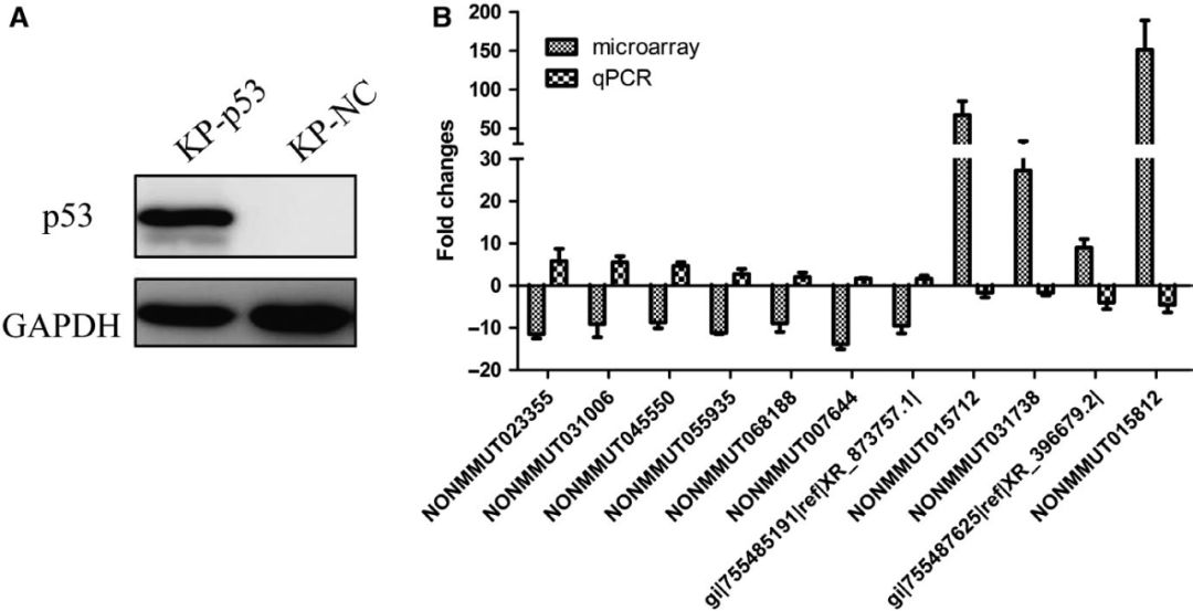 p53是臨床肺癌中最常見(jiàn)的突變抑癌基因,在我們的肺腺癌小鼠模型和KP細胞中均被誘導完全敲除。因此,作者探索了所選擇的210個(gè)保守的lncRNAs的非調控表達是否與p53的缺失有關(guān)。攜帶p53基因的慢病毒顆??稍贙P細胞中重新表達p53。如下圖A所示,p53在穩定感染的KP細胞中有效地重新表達。qPCR結果顯示,p53再表達顯著(zhù)改變了11個(gè)lncRNAs的表達(FC≥1.5),且差異倍數與上述p53缺失的肺腺癌組織芯片數據相反(圖B),表明p53的再表達對LncRNAs的表達有顯著(zhù)影響。