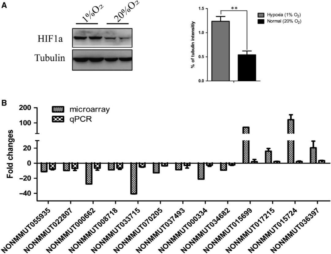 缺氧是實(shí)體腫瘤的一個(gè)顯著(zhù)特征,低氧腫瘤通常對傳統的癌癥治療有抵抗力,且腫瘤低氧與晚期惡性腫瘤和轉移相關(guān)。作者進(jìn)一步研究了低氧調節的潛在的lncRNAs。將KP細胞在常氧(20% O2)和缺氧(1% O2)中培養48h,WB結果顯示缺氧可有效上調KP細胞HIF1α的表達(圖A)。RT-PCR結果顯示,缺氧誘導的KP細胞中有13個(gè)lncRNAs表達下調,4個(gè)lncRNAs在缺氧誘導下表達上調,其表達變化方向與小鼠肺腺癌組織芯片中的表達變化方向一致(圖B)。