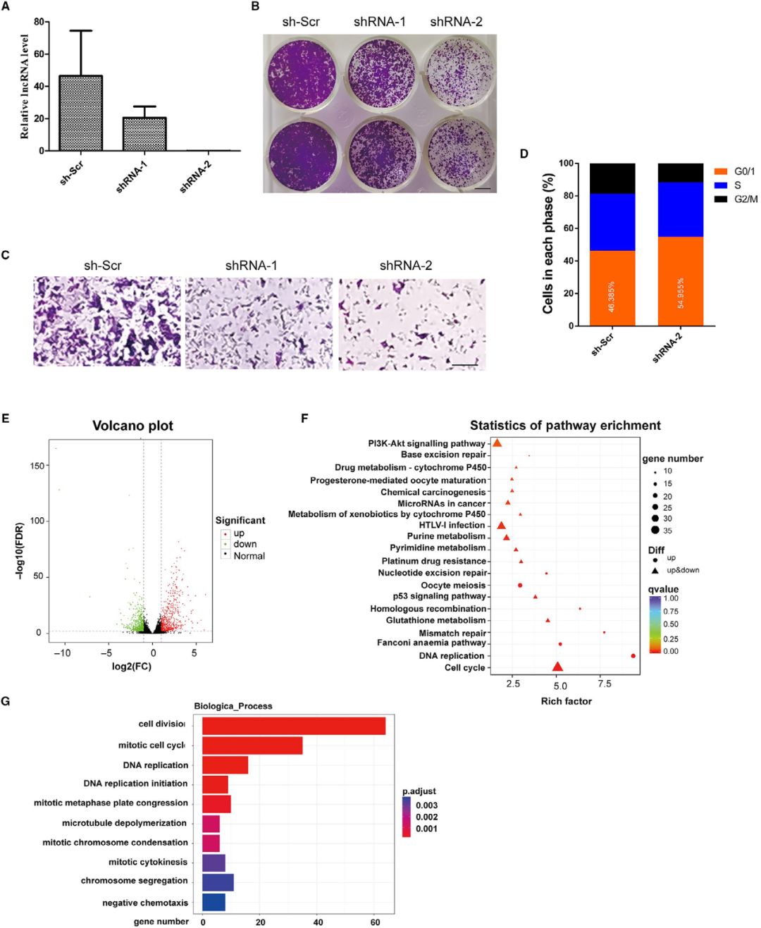 通過(guò)設計慢病毒介導的shRNAs來(lái)下調NONMMUT015812的表達,qPCR結果顯示其可使KP細胞中NONMMUT015812的表達減少80%以上(圖A)??寺⌒纬蓪?shí)驗顯示,NONMMUT015812基因的敲除顯著(zhù)抑制了KP細胞的生長(cháng)(圖B)。此外,在Transwell實(shí)驗中,穩定的NONMMUT015812基因敲除的KP細胞與對照細胞相比遷移明顯減少(圖C)。流式細胞術(shù)分析表明,NONMMUT015812基因敲除導致KP細胞明顯阻滯于G0/G1期,G2/M期細胞數量減少(圖D)。而NONMMUT015812基因敲除對細胞凋亡無(wú)明顯影響。