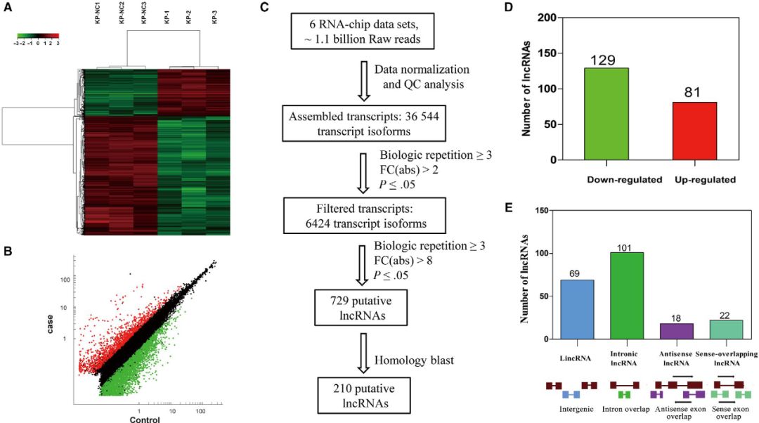 使用芯片技術(shù)檢測lncRNA,差異表達lncRNAs的散點(diǎn)圖和聚類(lèi)圖顯示了肺腺癌和正常肺樣本之間有明顯區別(圖A、B)。重點(diǎn)研究了在人和鼠之間具有較高差異倍數且保守的lncRNAs,當FC>8,P<0.05時(shí),鑒定到729個(gè)lncRNA。根據染色體位置保守性和序列保守性,篩選出210個(gè)具有潛在人類(lèi)同源物的lncRNA用于后續驗證,其中129個(gè)上調,81個(gè)下調(圖C、D)。根據其基因組位置,將210個(gè)lncRNA分為u(基因間)、i(內含子)、x(反義)和o(正義重疊)四大類(lèi)。已鑒定的lncRNAs大部分屬于i類(lèi),有101個(gè)(48.09%)(圖E)。