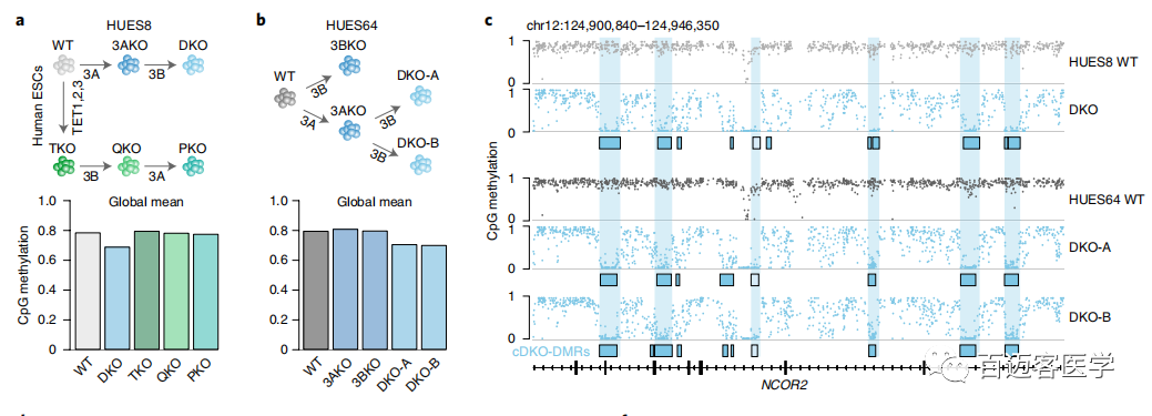 尚無(wú)研究直接比較喪失所有去甲基酶和甲基轉移酶化對轉錄和基因組調控以及細胞活性的影響。為了檢查去除所有DNA甲基化活性調節蛋白的分子后果,作者生成了在DNMT3A和-3B以及所有3個(gè)TET蛋白均缺失的五元敲除( pentuple-knockout,PKO)人類(lèi)ESC進(jìn)行相關(guān)研究。