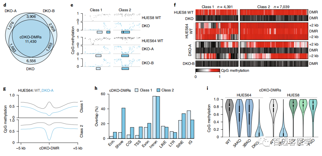 為了進(jìn)一步研究這種甲基化缺失,接下來(lái)從另一個(gè)人類(lèi)ESC系(HUES64)(包括2個(gè)獨立的DKO克?。ˋ和B))WT和DKO細胞進(jìn)行了甲基化測序,并將甲基化水平與先前衍生的18個(gè)單DNMT3A-/-(3AKO)和單DNMT3B-/-(3BKO)敲除數據作比較(圖1b)。兩種不同的雄性WT ESC似乎具有可比性,具有相似的整體甲基化平均值(HUES64,0.79;HUES8,0.78),并且在1kb分辨率上具有較高的相關(guān)性(Pearson系數=0.93)。有趣的是,盡管第22代的單DNMT3基因敲除仍保持高度甲基化(3AKO,0.81;3BKO,0.79),但2個(gè)HUES64 DKO克隆僅經(jīng)過(guò)3代后甲基化降低至0.70(圖1b)。當我們以堿基對的分辨率檢查數據時(shí),觀(guān)察到2個(gè)不同的動(dòng)態(tài)類(lèi)別:0.1-0.2的細微下降,影響了整個(gè)基因組范圍內約10%的CpG,以及,在CpG島內局部發(fā)生的甲基化幾乎完全喪失的CpG位點(diǎn)(圖1c)。使用嚴格的標準(甲基化差異> 0.6,P <0.01,F檢驗)來(lái)定義差異甲基化區域(DMR)。DKO-DMR在3個(gè)DKO譜系上都非常一致(圖1c,d)。因此,定義了在所有3個(gè)樣品中均被甲基化的“一致性”的11,430個(gè)cDKO-DMR,cDKO-DMR始終保持較低水平(平均WT,0.749;DKO,0.086),平均長(cháng)度為688個(gè)堿基對(bp)。WT ESC中大約三分之一cDKO-DMR鄰近低甲基化區域,例如CpG島和轉錄起始位點(diǎn)(稱(chēng)為“1類(lèi)”),而其余的cDKO-DMR則位于其他高度甲基化的區域(內含子或基因間),具有明顯的高甲基化邊界(稱(chēng)為“第2類(lèi)”;圖1e–h)。幾乎所有的cDKO-DMR(93%)都被DNMT3A或-3B甲基化,僅在DKO中被完全去甲基。