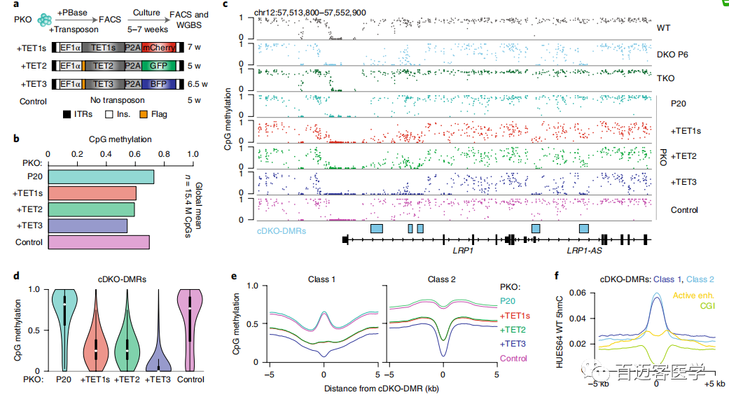 為了驗證cDKO-DMR是否依賴(lài)并持續誘導TET活性,利用PiggyBac轉座將外源TET1(短isoform簡(jiǎn)稱(chēng)TET1s)、TET2和TET3重新引入PKO細胞中,并使用WGBS測量了總體甲基化水平(圖2a)。在異位表達每種蛋白質(zhì)后,PKO細胞的總體平均甲基化水平從第20代的0.73明顯降低到了異位表達每種蛋白質(zhì)后的0.61、0.59和0.54,而僅用轉座酶轉染的對照細胞保持穩定(平均值=0.70;圖2b)。重新引入任何TET酶可在很大程度上恢復TKO細胞中異常高甲基化的區域,誘導快速的cDKO-DMR去甲基化(圖2c-e)。從機理的角度來(lái)看,TET1s亞型缺乏CXXC結構域,無(wú)法募集至未甲基化的CpG密集區域,但TET1和TET2 rescue結果之間無(wú)明顯差異,支持了CXXC結構域無(wú)關(guān)的募集機制。TET及其作用相反的酶在cDKO-DMRs上的持續動(dòng)態(tài)也得到了已發(fā)表的染色質(zhì)免疫沉淀的支持,隨后進(jìn)行ChIP-seq,該數據表明WT ESC中DNMT3B和TET1均富集,盡管富集在比相當狹窄且定義明確的cDKO-DMR邊界更寬區域。最后,進(jìn)行了全基因組氧化亞硫酸氫鹽測序(oxBS),并在WT細胞中發(fā)現了5hmC的顯著(zhù)局部富集(平均cDKO-DMRs,0.07;背景,0.01;圖2f)。