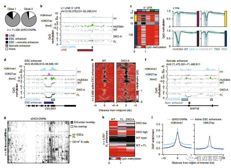 盡管TET可以募集到LINE 5’UTR,但它們更頻繁地定位于啟動(dòng)子或活性增強子,使它們保持低甲基化狀態(tài)。的確,有7%的cDKO-DMR與低甲基化的活性增強子相鄰,支持了先前的證據表明DNMT3s保護了增強子的邊界免受擴展的低甲基化作用(圖3a,d,e)??紤]到TETs在活性增強子中的典型作用,作者認為也可能代表僅在其他細胞狀態(tài)被激活時(shí)才經(jīng)歷去甲基化的調節元件。令人驚訝的是,有85%的cDKO-DMR與至少一種先前定義的組織特異性增強子重疊,并且在相關(guān)的細胞類(lèi)型中被特異去甲基化(圖3a,f,g)。盡管cDKO-DMR幾乎總是體細胞增強子,但事實(shí)并非如此:許多體細胞增強子已經(jīng)在ESC中甲基化,在其相關(guān)組織中保持高度甲基化,或者盡管在其他發(fā)育過(guò)程中失去了甲基化,但在ESC中并未顯示出TET依賴(lài)性去甲基化(圖3h)。為了探索DMR的穩定性,進(jìn)一步傳代了HUES64 DKO克隆A細胞并進(jìn)行了WGBS。在經(jīng)過(guò)28次無(wú)DNMT3活性的傳代后,鑒定到增加了59,618個(gè)DKO-DMR,其中79%與推定的組織特異性增強子重疊。在后期傳代的DKO細胞中,約有三分之一的體細胞增強子仍保持甲基化狀態(tài)。為了檢查增強子去甲基化的能力是否與發(fā)育時(shí)期相關(guān)(它們在發(fā)育過(guò)程中被激活時(shí)),利用最近發(fā)表的數據集,詳細介紹了從HUES64 ESCs到胰島分化的9個(gè)階段中增強子的激活和甲基化動(dòng)力學(xué)。有趣的是,在分化的每個(gè)階段,相似比例的增強子與DKO-DMR重疊,在末端分化的階段,其頻率略高。盡管是推測性的,與ESC分化之間缺乏明顯聯(lián)系表明,一部分胚胎和成年組織特異性增強子可能以依賴(lài)于DNMT3和TET的持續和相反功能的狀態(tài)存在。