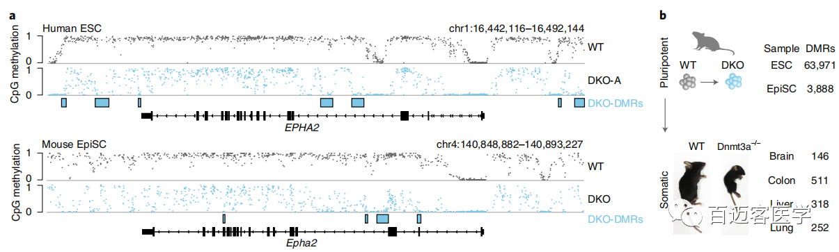 為了探索這種局部調節的動(dòng)態(tài)甲基化的保守性,在小鼠表皮干細胞(EpiSCs)中突變了Dnmt3a和Dnmt3b,因為它們代表了與人類(lèi)多能細胞最接近的發(fā)育和分子類(lèi)似物。在第4步對WT和DKO細胞進(jìn)行了WGBS測序,并鑒定了3888個(gè)與人類(lèi)DKO-DMR具有相似特性的DMR,與82%的推定體細胞增強子重疊。雖然數量、√確序列和坐標未直接在物種之間map,但小鼠DKO-DMR出現在非常相似的位置且與直系同源基因接近(圖4a)。因此,在體細胞增強子處甲基化轉換的機制和這些區域的調控模式都看起來(lái)非常保守。