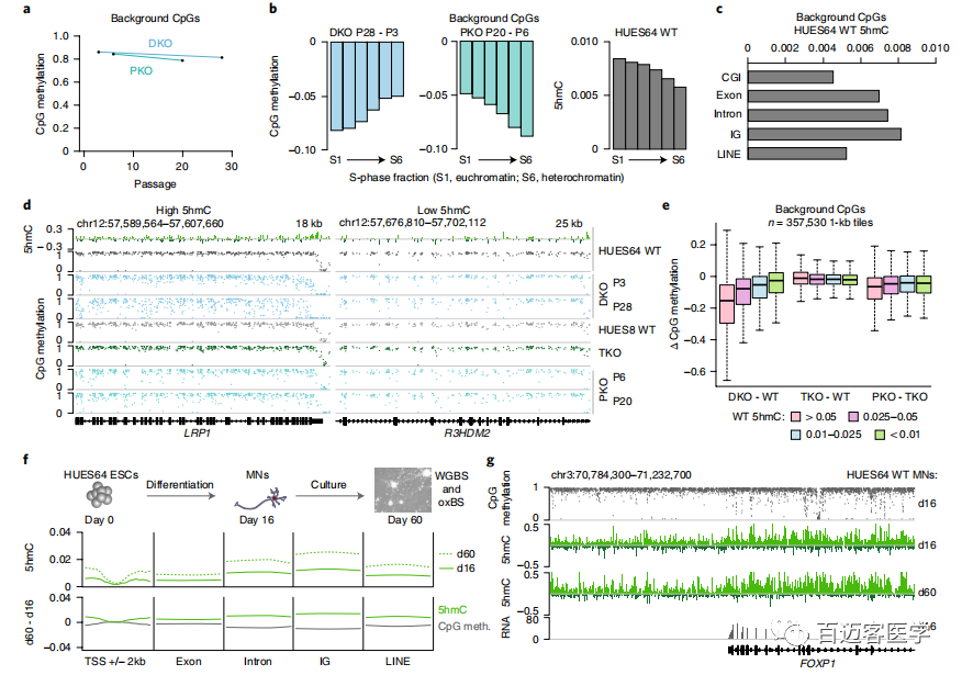 通常,如果不被DNMT3A或DNMT3B抵消,這種活性將導致胞嘧啶修飾的連續轉換和整體甲基化的降低。在這種范式下,人們可能會(huì )期望ESC在TET丟失后顯示出整體甲基化增加,因為這將使平衡向DNMT3活性轉移。與期望相反,并且如先前在癌細胞中所指出的,與匹配的WT相比,在缺乏TET的細胞中也觀(guān)察到了輕微的下降。與WT相比,這可能與TKO細胞的生長(cháng)速率增加有關(guān),這也可能影響甲基化維持。
