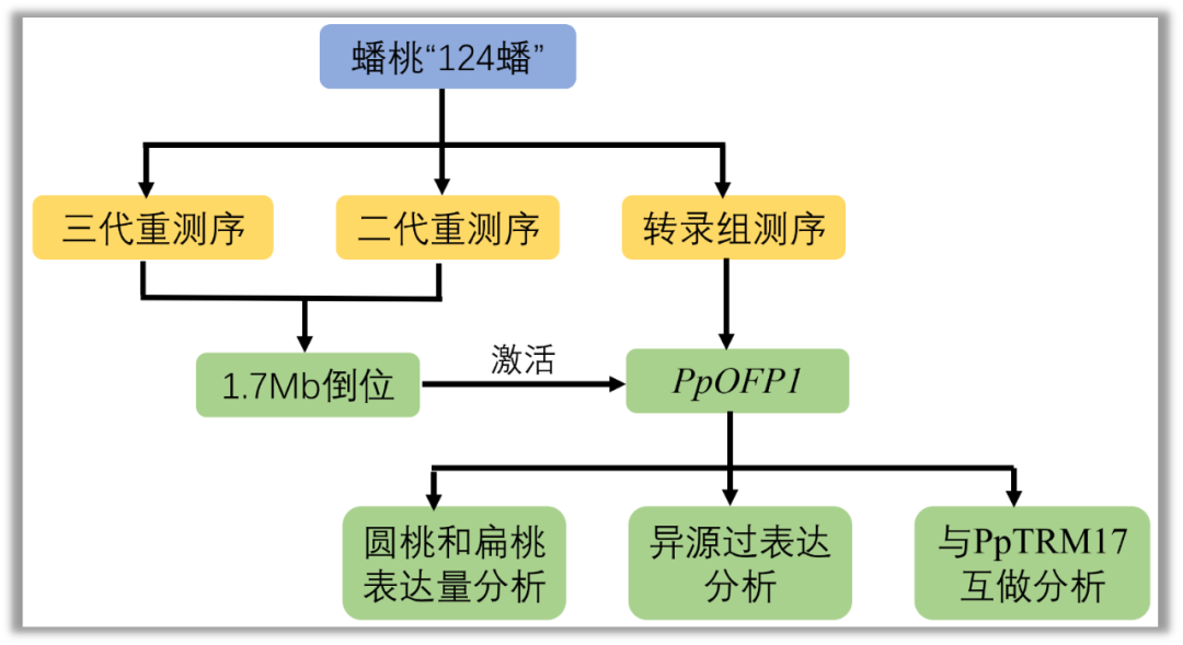 那么同樣是桃子,為什么蟠桃是扁的呢?近日,國際知名期刊Plant Biotechnology Journal(IF=8.15)在線(xiàn)發(fā)表了中科院武漢植物園韓月彭老師課題組及其合作單位共同的研究成果“1.7-Mb chromosomal inversion downstream of a PpOFP1?gene is responsible for flat fruit?shape in peach”,該研究發(fā)現在蟠桃基因組中存在1個(gè)1.7Mb的倒位,而該變異會(huì )激活其附近的基因PpOFP1表達,導致蟠桃扁平果實(shí)。在該研究中,大片段的結構變異的檢測是分析的基礎,而三代測序技術(shù)能夠高效地助力大片段倒位的發(fā)現。今天大師兄為大家奉上文章解讀,以饕讀者。