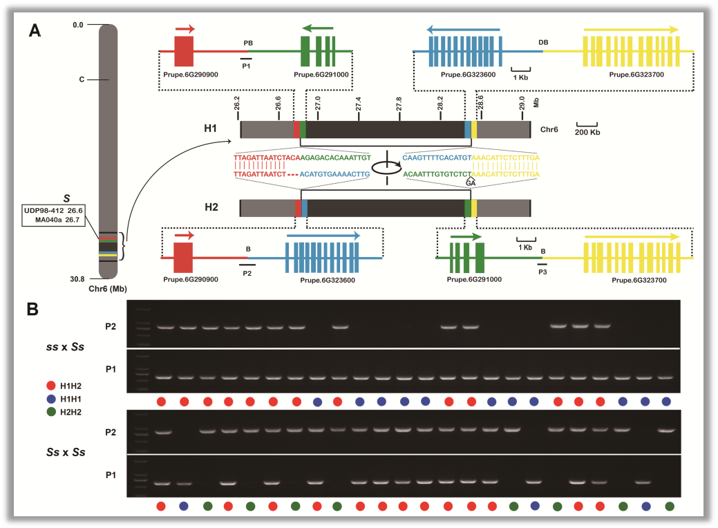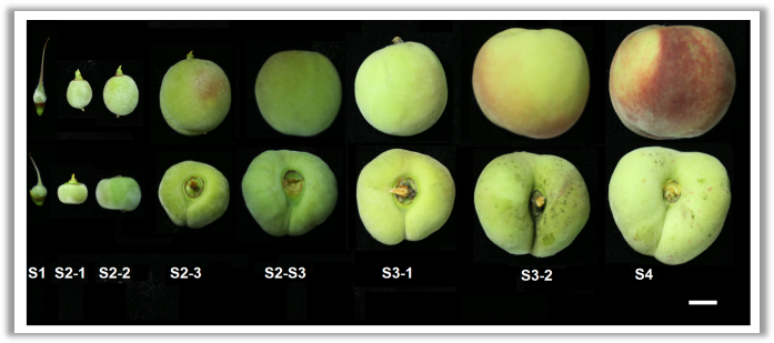桃起源于250萬(wàn)年前的中國青藏高原的西南部,在中國已有4000年的栽培史,其中有一個(gè)獨特變種—蟠桃,蟠桃果實(shí)呈扁平狀,體積較小,和我們常見(jiàn)的圓形桃子有明顯區別,雖然長(cháng)相一般,不過(guò)它具有酸度低、糖含量高等優(yōu)異品質(zhì),受到越來(lái)越多的消費者喜愛(ài)。蟠桃果實(shí)扁平的特征受6號染色體上的S位點(diǎn)調控,同時(shí)S位點(diǎn)與控制鮮重和果實(shí)敗育位點(diǎn)緊密連鎖。關(guān)于S位點(diǎn)的基因定位研究有多次報道,發(fā)現2個(gè)臨近候選基因(CAD1和LRR-RLK)與果實(shí)扁平的性狀共分離,但后續又有研究顯示這2個(gè)基因并非與CAD1和LRR-RLK共分離。所以,對于扁桃扁平性狀的遺傳基礎研究仍待繼續。