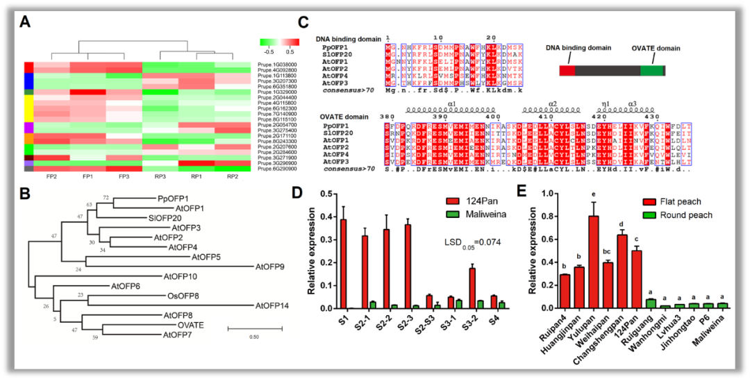 通過(guò)比較扁桃和圓桃果實(shí)發(fā)育過(guò)程中果實(shí)縱徑和果實(shí)橫徑的變化,發(fā)現在S2時(shí)期兩者果實(shí)增長(cháng)均較快(圖2),于是作者在S2時(shí)期選擇多個(gè)扁桃和圓桃進(jìn)行轉錄組測序,結果在S位點(diǎn)附近發(fā)現1個(gè)在扁桃中上調差異表達基因rupe.6G290900(PpOFP1)(圖3A)。PpOFP1與AtOFP1和SlOFP20為同源基因,2個(gè)基因分別負調控擬南芥細胞伸長(cháng)以及番茄子房發(fā)育,從而說(shuō)明PpOFP1很有可能是引起果實(shí)形狀變化的候選基因。在果實(shí)發(fā)育S2期,扁桃果實(shí)中PpOFP1表達量顯著(zhù)高于圓桃(圖3D,E),RNA原位雜交也顯示PpOFP1基因在外皮層和內皮層細胞分裂區,該結果再次證實(shí)PpOFP1在果實(shí)縱向發(fā)育過(guò)程中發(fā)揮重要作用。