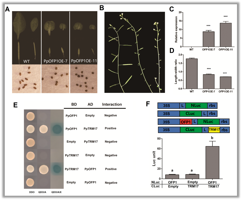 前期研究發(fā)現OFP基因家族與TRM基因家族存在互做來(lái)調控植物器官形狀,于是作者分析了可能與PpOFP1互做的TRM基因,在桃子基因組中篩選到1個(gè)可能的互做基因PpTRM17,通過(guò)酵母雙雜(圖4E)和螢火蟲(chóng)熒光素酶雙分子互補實(shí)驗(圖4F),發(fā)現PpOFP1能夠與PpTRM17存在互做關(guān)系。