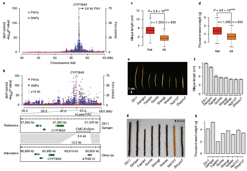 泛基因組可以結合GWAS數據,有效提高GWAS 的準確性,捕獲到更加完整的遺傳變異信息。通常,GWAS分析是將個(gè)體材料與參考基因組進(jìn)行比對,然后將得到的 SNP 與表型進(jìn)行關(guān)聯(lián)分析,當GWAS 分析參考基因組不存在的功能基因引起的表型時(shí),會(huì )出現 GWAS 定位區間與實(shí)際功能基因之間較大偏差甚至檢測不到的情況。但以泛基因組為參考基因組,把結構變異作為基因型數據用于 GWAS 分析,可以有效解決這類(lèi)因單一參考基因組而導致的信息不全問(wèn)題。例如,油菜以泛基因組鑒定到的 PAV 為基因型進(jìn)行GWAS 分析,直接鑒定到基因BnaA9.CYP78A9啟動(dòng)子區存在一段 3.9 kb 的插入,該變異嚴重影響油菜的角果長(cháng)和粒重[2]。結構變異相關(guān)的GWAS研究更具有新意,也是后續研究的熱點(diǎn)。