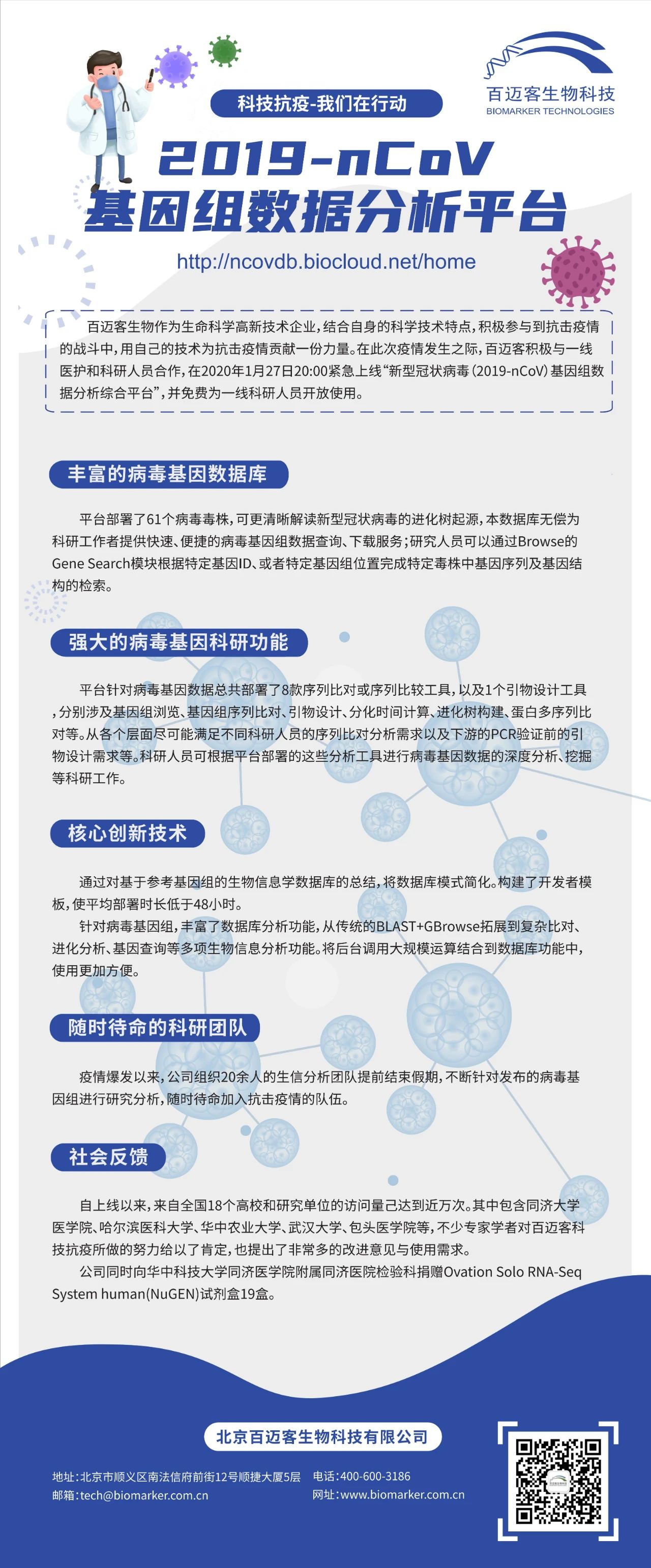在疫情防控這個(gè)特殊的戰場(chǎng),百邁客作為三代測序和生物云-BMKCloud服務(wù)提供商,結合自身的技術(shù)特點(diǎn),在疫情爆發(fā)初期積極的參與到抗擊疫情的戰斗中,與一線(xiàn)的醫護和科研人員合作,結合一線(xiàn)的需求,積極調動(dòng)各種資源,經(jīng)過(guò)十幾天夜以繼日的開(kāi)發(fā),通過(guò)對各數據庫中的新型冠狀病毒數據進(jìn)行合理整合分析,于2020年1月27日20:00時(shí)及時(shí)上線(xiàn)了首版“2019-nCoV新型冠狀病毒基因組數據分析平臺”(http://ncovdb.biocloud.net/home)?。本數據庫配合國家公共資源數據庫為社會(huì )提供更全面、及時(shí)、準確的數據資源。為我們的一線(xiàn)科研人員提供免費服務(wù)。