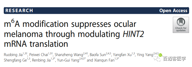 總的來(lái)說(shuō),m6A修飾在眼黑色素瘤腫瘤發(fā)生中的關(guān)鍵作用。在眼黑色素瘤樣本中m6A水平降低,提示預后不良,且整體m6A修飾的改變與腫瘤進(jìn)展密切相關(guān)。機制上,YTHDF1促進(jìn)了眼部黑色素瘤腫瘤抑制因子HINT2 mRNA甲基化修飾,影響轉錄后翻譯。本研究揭示了m6A甲基化修飾在眼部黑色素瘤腫瘤中功能,為后續機制研究以及藥物治療提供了新的見(jiàn)解。