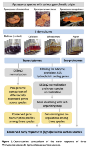 選取四種不同地理分布的擔子菌門(mén)/密孔菌屬真菌(P.coccineus、P.sanguineusand、P. puniceus、P.cinnabarinus)研究其在不同類(lèi)型的纖維素基質(zhì)下相關(guān)酶的代謝情況。通過(guò)設置不同碳素培養基:麥芽糖(對照)、秸稈、松木、楊木,模擬對自然界中不同材質(zhì)的木材的分解能力。探究Pycnoporus屬在基因組、轉錄組、分泌蛋白組層面的共性和差異性,以期找出它們在木質(zhì)纖維素降解上存在的共性機制。