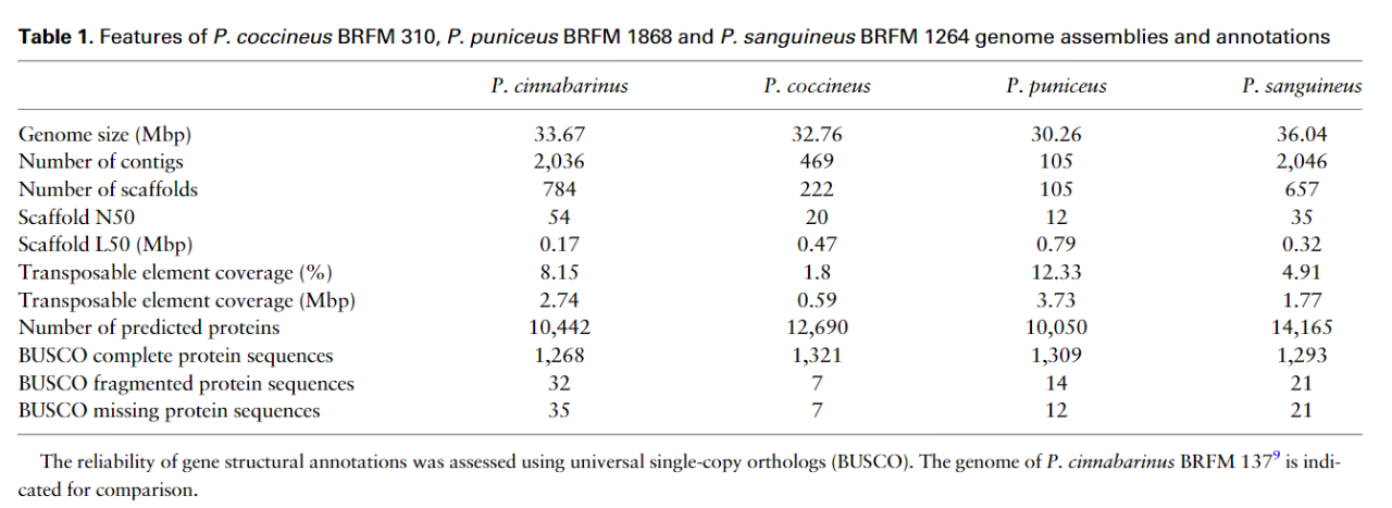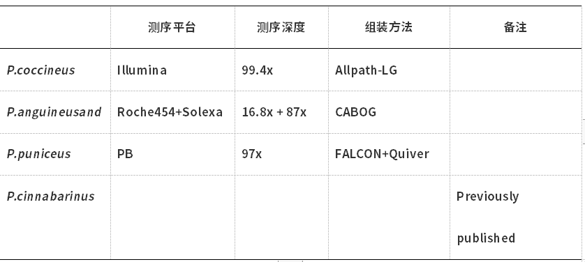 分別對P.coccineus、P.sanguineusand、P. puniceus、P.cinnabarinus的基因組進(jìn)行測序和組裝,四種真菌基因組大小差異不大,編碼基因組的數量上也比較接近。