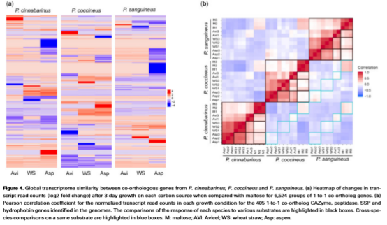 本文通過(guò)比較基因組,轉錄組和蛋白組等多組學(xué)方法對擔子菌門(mén)下的密孔菌屬的真菌進(jìn)行研究,發(fā)現它們在木材降解反應中存在著(zhù)一些保守的酶學(xué)反應特征,包括產(chǎn)過(guò)氧化氫酶和耗過(guò)氧化氫酶協(xié)同作用,纖維二糖脫氫酶和AA9溶解性多糖單氧酶協(xié)同作用。