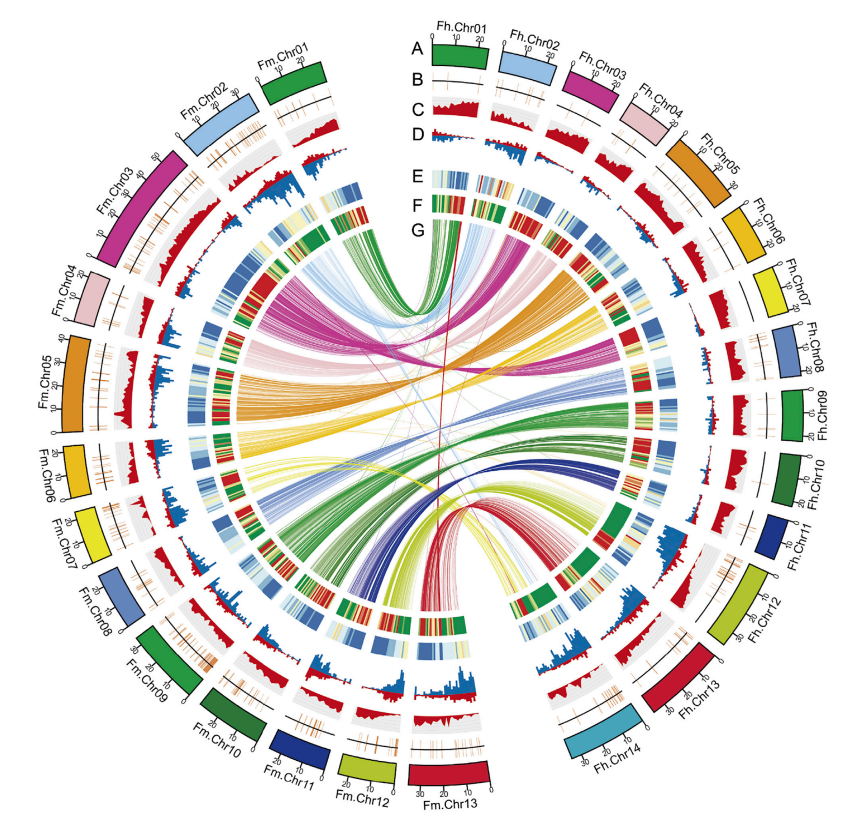 兩種榕樹(shù)基因組比較發(fā)現有大量結構變異,細葉榕的3號染色體FmChr03,與對葉榕3號及7號染色體(FhChr03、FhChr07)發(fā)生融合或裂變事件,重排區內的基因富集顯示主要與植物免疫功能有關(guān)。兩種榕樹(shù)在真雙子葉植物的三倍體事件之后,均沒(méi)有檢測到全基因組復制(WGD)事件。全基因組比對分析表明,兩個(gè)榕樹(shù)基因組共有約38Mb 片段重復(SDs),表明SD是基因組規模擴大的主要因素。