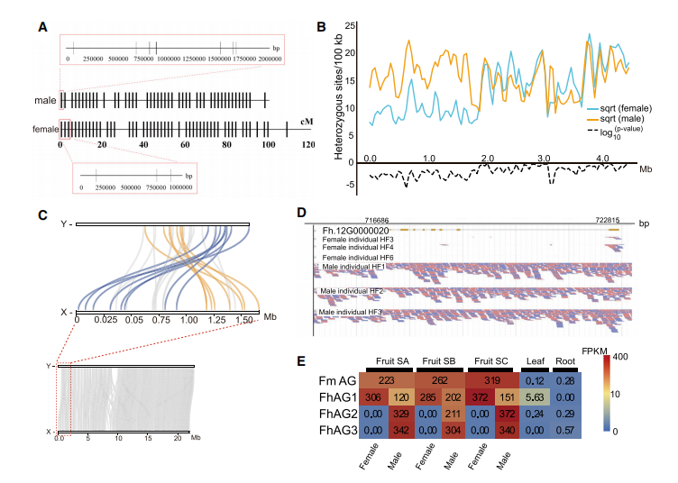 此外,作者新開(kāi)發(fā)了染色體定相方法并重新組裝了X和Y染色體。X染色體和Y染色體中分別為21.9 Mb和22.6 Mb,表明Y染色體已經(jīng)擴展了700 kb(圖3C)。比較X和Y染色體,結合存在或缺失變異(PAV)分析及RNA-seq分析以及重測序比對,顯示蛋白編碼基因(Fh.12g000020)基因只存在于雄性基因組中,而不存在于雌性基因組中,是影響性別決定的主要因素(圖3E)。