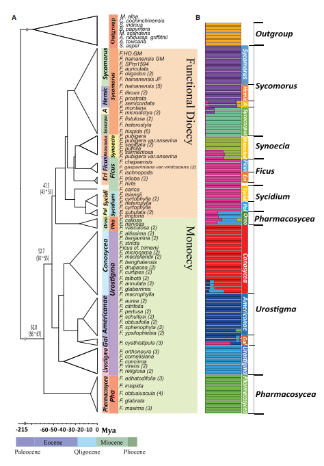 利用112份榕樹(shù)材料的基因組重測序數據,建立了榕樹(shù)的系統發(fā)育史,其中包括62種榕樹(shù)屬,包括2個(gè)雌雄同株亞屬(Pharmacosycea, Urostigma)和4個(gè)雌雄異株亞屬(Sycidium,Sycomorus, Synoecia?,Ficus),它們代表了榕樹(shù)的6個(gè)亞屬和主要分支。白肉榕亞屬(Pharmacosycea)被分至兩類(lèi),進(jìn)化樹(shù)、ADMIXTURE、遺傳相關(guān)性分析及ABBA-BABA分析發(fā)現了整個(gè)屬存在潛在廣泛的種間雜交。系統發(fā)育揭示了雌雄同株代表了整個(gè)屬的祖先繁殖系統(圖4)。分化時(shí)間顯示,始新世時(shí)期(約47.5 Mya)出現了雌雄同株和雌雄異株的分化。