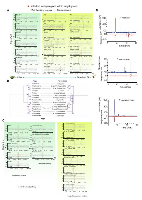 七千五百萬(wàn)年來(lái),榕樹(shù)和榕小蜂之間的專(zhuān)性協(xié)同進(jìn)化在這個(gè)協(xié)同進(jìn)化系統中形成了形態(tài)和生理上的相適應。榕樹(shù)在全球和當地都有極高的物種多樣性,同域近緣榕果物種間生殖隔離的主要原因是傳粉蜂的特異性。為了探討榕果與傳粉蜂協(xié)同進(jìn)化的潛在分子機制,作者利用14個(gè)來(lái)自Sycomorus亞屬的榕樹(shù)和其相應傳粉蜂的重測序數據進(jìn)行分析。系統發(fā)育分析表明,在這個(gè)分類(lèi)水平上,寄主關(guān)聯(lián)具有很強的保守性,同時(shí)也檢測到一些寄主轉移事件。為了確定在這些協(xié)同進(jìn)化的物種中可能經(jīng)歷了相互選擇和分化的候選基因,作者利用Tajima’D和SweeD分析對榕果和傳粉蜂基因組進(jìn)行了選擇性清除分析,顯示在榕果和傳粉蜂中生長(cháng)相關(guān)的基因、榕果揮發(fā)物相關(guān)基因和傳粉蜂化學(xué)感應系統相關(guān)基因受到一定的選擇作用。并通過(guò)榕小蜂對三種不同榕果釋放揮發(fā)物質(zhì)的電生理測試,支持了甲羥戊酸和莽草酸途徑在吸引特定傳粉者方面的重要作用(圖5),揭示了在這種專(zhuān)性互利共生中共分化的潛在分子機制。