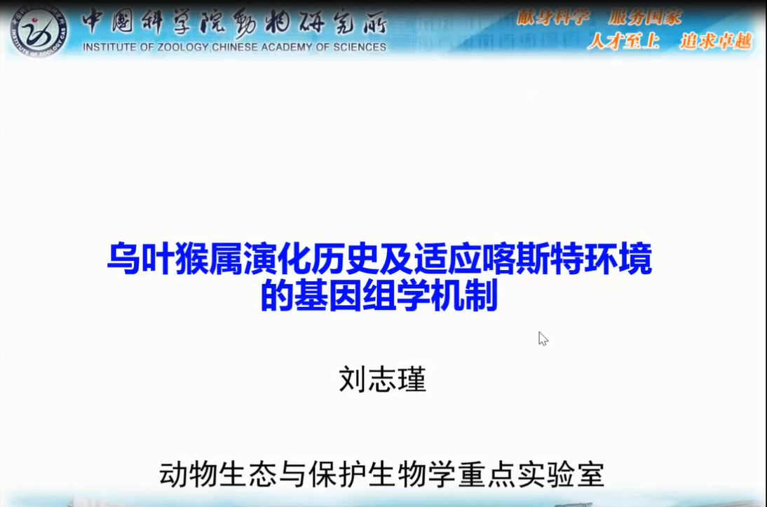 中國科學(xué)院動(dòng)物研究所劉志瑾副研究員詳述了烏葉猴屬中黑葉猴種組、銀葉猴種組、郁烏葉猴種組三個(gè)種組演化地位和種群動(dòng)態(tài)。并對石山葉猴和雨林葉猴兩大類(lèi)群以及黑葉猴種組的分化情況進(jìn)行了深入闡述。研究最后推斷EDNRB基因是在自然選擇過(guò)程中,在白頭葉猴遺留下來(lái)的環(huán)境適應性毛色表型的關(guān)鍵機制。劉老師的報告使相關(guān)領(lǐng)域學(xué)者對靈長(cháng)類(lèi)生態(tài)分類(lèi)群中的基因-環(huán)境相互作用和生理-形態(tài)適應機制有了新的認識。
