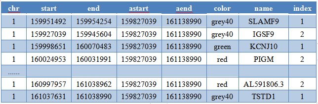 首先用你能用的辦法將目標區域(1:160000000-161000000)內的基因、目標區域上游的兩個(gè)基因、目標區域下游的一個(gè)基因的位置都提取出來(lái),然后為每個(gè)基因賦一個(gè)顏色。中間灰色的bar兩端的突出可以從第一個(gè)基因的開(kāi)始位置向上游擴100K、最后一個(gè)基因的結束位置向下游擴100K。整理成作圖用的輸入文件,如下:
