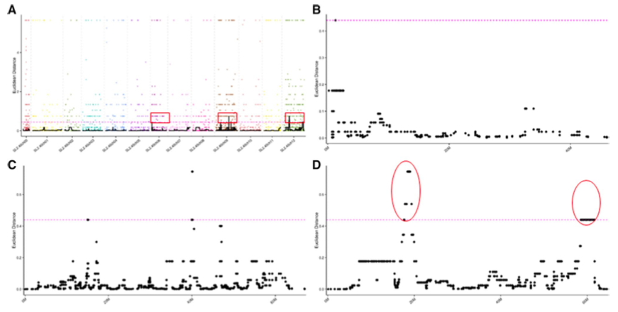 接著(zhù)利用混池間差異SNP的深度差異,使用ED算法來(lái)分析計算與目的基因相連鎖的區域,結果顯示12號染色體上存在兩個(gè)較大且較明顯的區域,這兩個(gè)區域的大小分別為1.75 Mbp和3.15 Mbp,作者最終確定這兩個(gè)區域與目標基因相連鎖,并將其選為候選區域(圖4);利用百邁客云平臺分析,在番茄12號染色體上的兩個(gè)候選區域內共找到26個(gè)候選基因,通過(guò)GO、KEGG數據庫比對分析,最終將Solyc12g027610.1確定為本研究的候選基因;對該基因功能進(jìn)行分析發(fā)現,Solyc12g027610.1參與了細胞分裂素的代謝過(guò)程,且與多種激素的信號轉導途徑有關(guān)。另外,Solyc12g027610.1作為一個(gè)乙烯受體蛋白,與番茄乙烯受體基因SlETR以及擬南芥中編碼蛋白AtEIN4的乙烯基因高度同源。